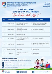 Chương trình “Em là học sinh Lớp 1” tại Trường TTH Việt Anh mang đến một buổi trải nghiệm trọn vẹn như một ngày đi học thật của con. Các hoạt động nổi bật trong chương trình:
