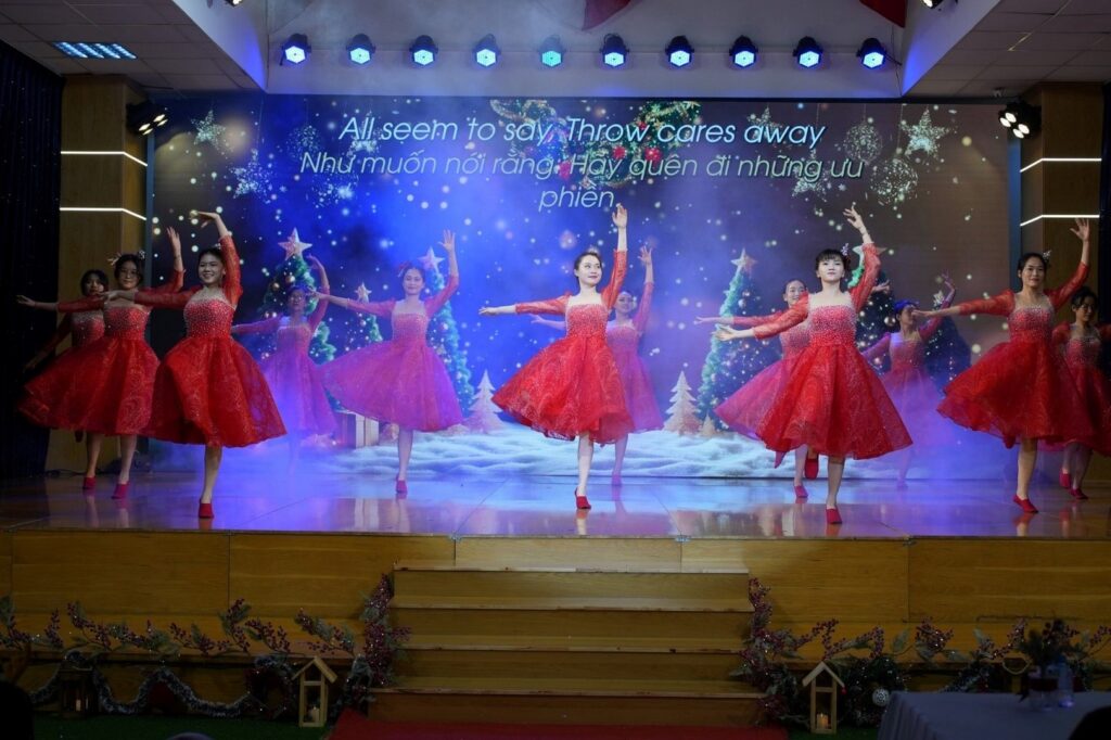 Nhộn nhịp cùng tiết mục trình diễn hát – nhảy “Chúa yêu trần thế đã xuống thế trần”, sự kết hợp giọng hát vui tươi của các thầy cô tổ Âm nhạc cùng các động tác nhảy đáng yêu của các em học sinh đã khiến tiết mục trở thành một điểm ấn tượng cho đêm nghệ thuật Giáng sinh ấm áp.