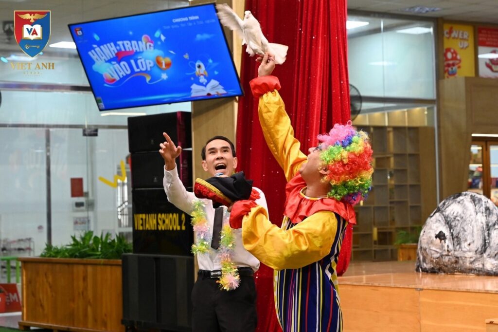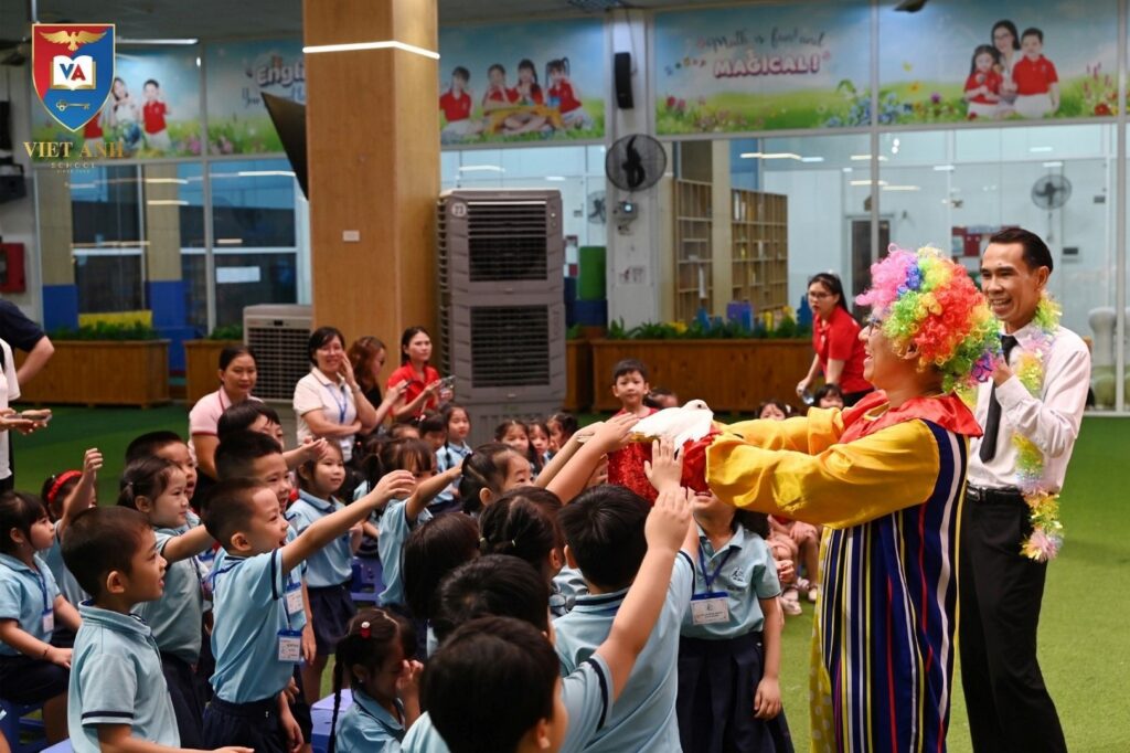 Ngay từ khi đặt chân đến trường, các bé đã được chào đón trong không khí rộn ràng, đầy màu sắc. Những màn giao lưu vui nhộn cùng chú hề, các tiết mục ảo thuật diệu kỳ cùng âm nhạc sôi động đã đã khiến bầu không khí tại sâu khấu nhà trường – nơi khu vực chào đón các bé trở nên sôi nổi đã mang đến tiếng cười và sự hào hứng cho tất cả các bạn nhỏ.