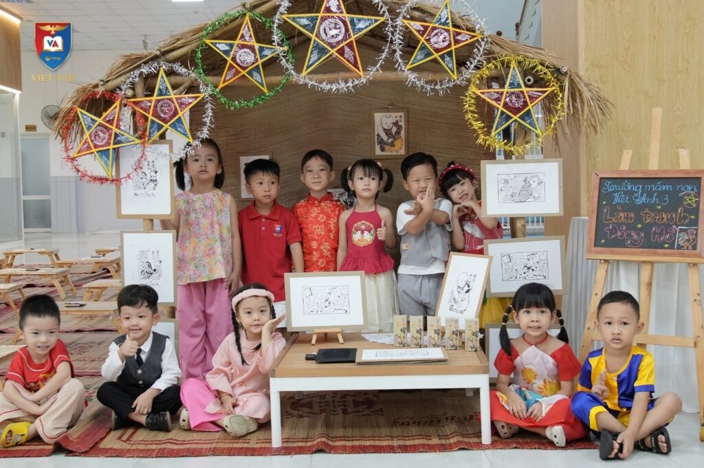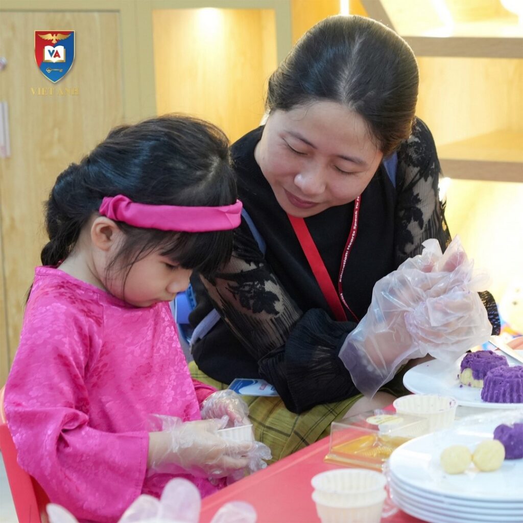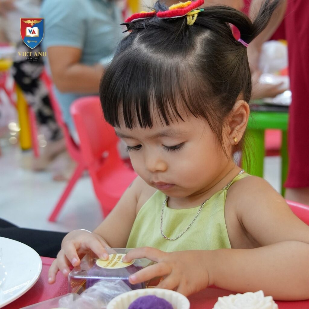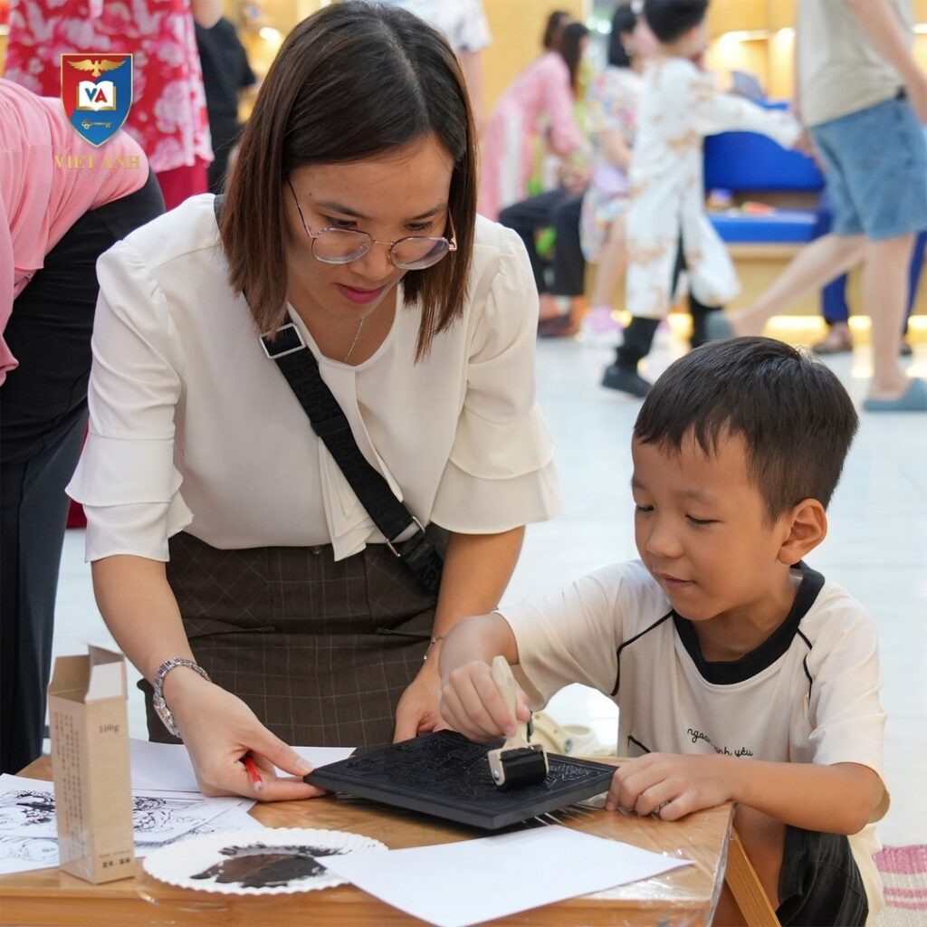 Các khu vực hoạt động cũng thu hút được nhiều sự quan tâm của các bé. Khu vực làm bánh Trung thu khoai lang tím, các bạn nhỏ hóa thân thành “đầu bếp nhí” tài năng và khéo léo làm ra những chiếc bánh thơm ngon và nhiều giá trị dinh dưỡng. Dưới sự hướng dẫn và đồng hành của ba mẹ, bé hăng say làm và đổ khuôn thật cẩn thận, tạo ra những chiếc bánh mang thương hiệu “Viet Anh 3 Kindergarten”. Tại góc “In tranh Đông Hồ”, đây là một hoạt động mới lạ, với mực đen, con lăn, bản in các bức tranh phổ biến như đám cưới chuột,  em bé ôm gà trống, trẻ chăn trâu thổi sáo, cá chép trông trăng,.. Các bé rất chăm chú và háo hức để tạo ra bức tranh Đông Hồ của riêng mình, hoạt động này cũng giúp các bé hiểu hơn về nét đẹp văn hóa dân gian, thể hiện tâm hồn, ước vọng và bản sắc của người Việt.
