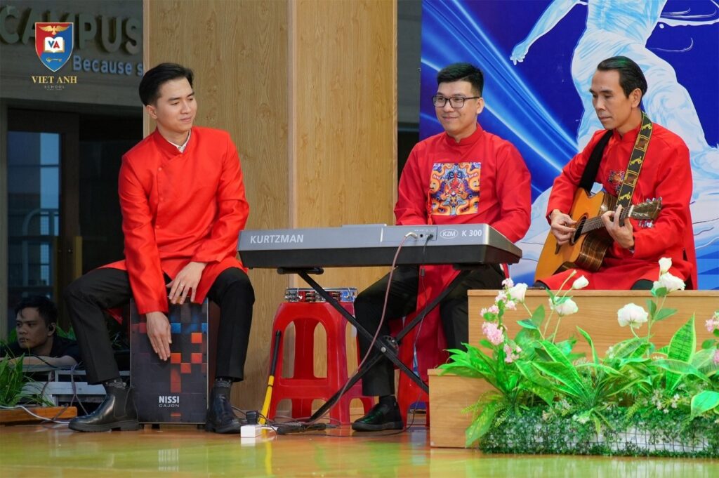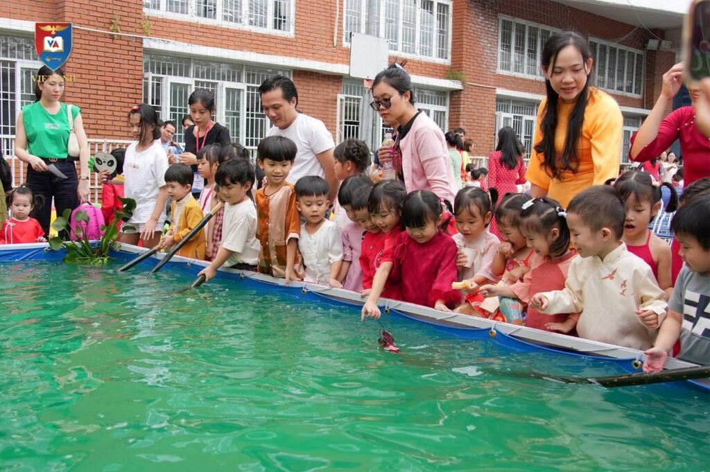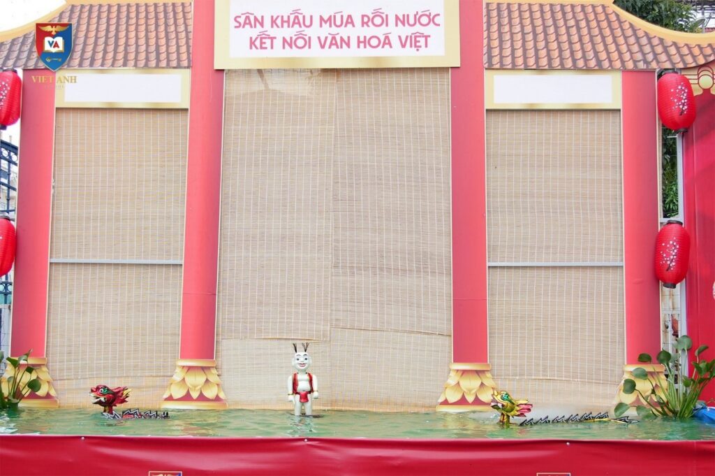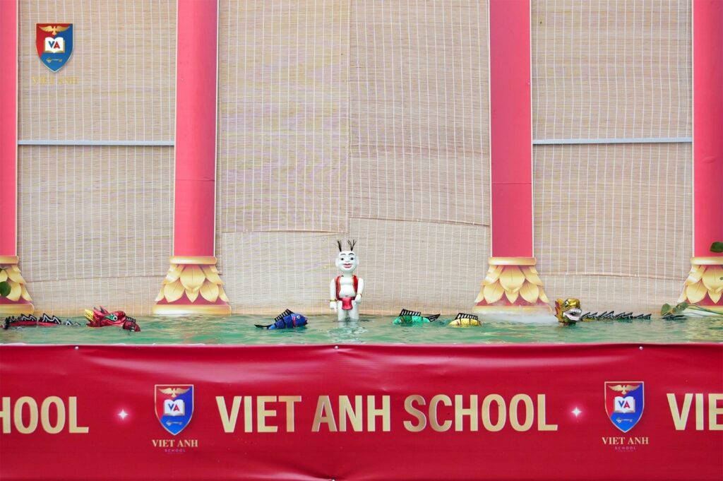 Điểm nhấn và nhận được sự quan tâm của phụ huynh và các bé là Sân khấu Múa rối nước với tiểu phẩm “Cá chép vượt Vũ Môn hóa rồng”. Thiết kế sân khấu gam đỏ nổi bật, sóng nước phun sương mờ ảo tạo một không gian cuốn hút. Đây cũng là lần đầu tiên sân khấu Múa rối nước có mặt tại trường Mầm non Việt Anh 3. Trong không gian rộng rãi tại sân bóng đá, nhà trường đã chu đáo chuẩn bị khu vực ngồi coi thoải mái cho bé và gia đình. Khi được theo dõi tiết mục, bé nào cũng reo hò thích thú và chăm chú lắng nghe từng cảnh diễn. Ấn tượng nhất là các con rối từ chú Tễu, cá chép đều do các cô giáo hóa thân thành nghệ nhân xuất sắc. Lối dẫn chuyện dí dỏm, cùng phần trình diễn đẹp mắt đã nhận được nhiều lời khen của khán giả dưới sân khấu. Bên cạnh đó, câu chuyện cũng mang đến bài học ý nghĩa về nghị lực sống, tinh thần vượt khó và nỗ lực hoàn thiện bản thân.