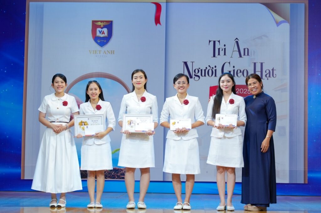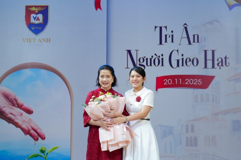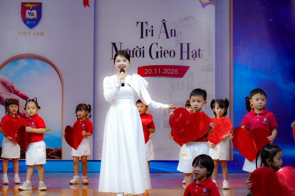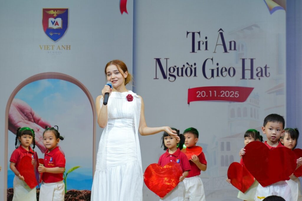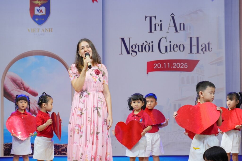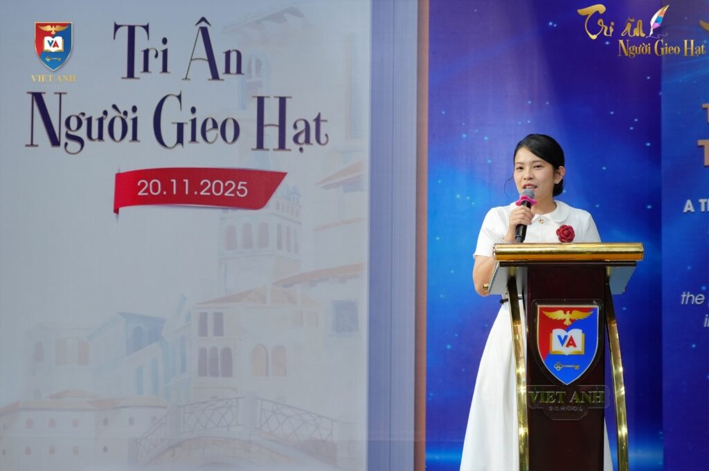 Cũng tại sự kiện buổi lễ “Tri ân người gieo hạt”, cô Nguyễn Ngọc Anh Thư – Hiệu trưởng trường Mầm non Việt Anh 3 đã có đôi lời phát biểu về hành trình của nghề Giáo thiêng liêng cũng như gửi lời cảm ơn chân thành và sâu sắc đến các cô giáo – những người “ươm mầm” không quản mệt nhọc mong gieo cho đời những hạt tri thức tốt đẹp, kiến tạo một thế hệ trẻ tài năng. Cùng với đó, cô Nguyễn Ngọc Anh Thư, đại diện Ban giám hiệu nhà trường cũng gửi lời tri ân đến Tiến sĩ Trần Phi Phượng – người cô luôn hết lòng, truyền cảm hứng và lan tỏa tinh thần yêu nghề, dẫn dắt đội ngũ giáo viên Mầm non Việt Anh 3 thêm mạnh mẽ và phát triển.