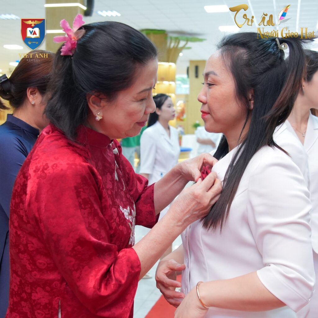 Bắt đầu từ lúc 15h00, không khí sắc màu cho Ngày Hiến Chương Nhà giáo Việt Nam 20/11 trở nên rộn ràng hơn bao giờ hết. Một trong những hoạt động truyền thống tại Mầm non Việt Anh 3 là “Nghi thức cài hoa” lên áo cô. Từng sắc hoa đỏ như sự rạng rỡ và tôn vinh lên những nỗ lực của các cô trong ngày này. Dẫu biết, nghề chăm trẻ bao điều khó khăn và vất vả nhưng mỗi cô giáo vẫn luôn dùng sự dịu dàng, từng lời nói yêu thương, ánh mắt trìu mến dành cho trẻ.